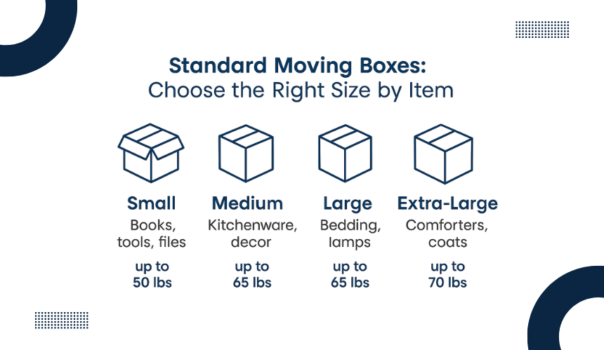 Understanding moving box types is the first step to packing smart. Box sizes can differ slightly by brand. A breakdown of the most common moving boxes, the weight they can hold, and the types of items they’re designed for is explained below.
