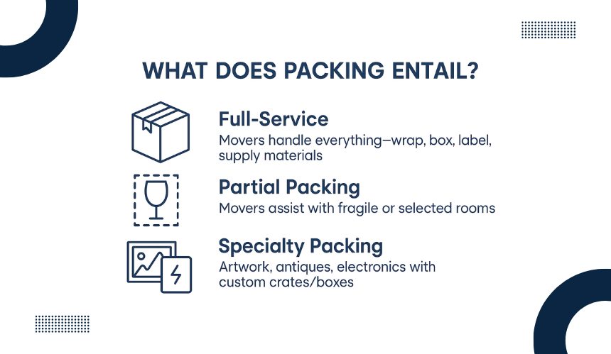 Full-service packing means the movers handle every aspect of your packing needs. This includes wrapping, boxing, and labeling all items, from fragile dishes to bulky furniture.