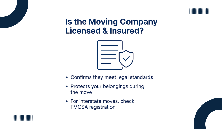 For interstate moves, the company should be registered with the Federal Motor Carrier Safety Administration (FMCSA), which oversees the moving industry and ensures companies comply with safety standards