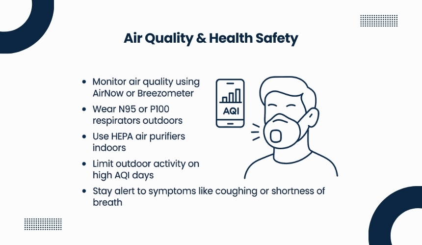 - Use Air Purifiers & Masks: Invest in high-efficiency air purifiers with HEPA filters to reduce harmful smoke particles indoors. Additionally, wear N95 or P100 respirators when you need to be outdoors to minimize inhalation of fine particulates.
