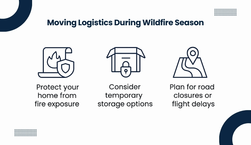 Wildfire season is unpredictable, and moving during this time can be particularly challenging. The key to a successful move is having an evacuation plan, securing insurance, and staying informed about air quality and weather forecasts.