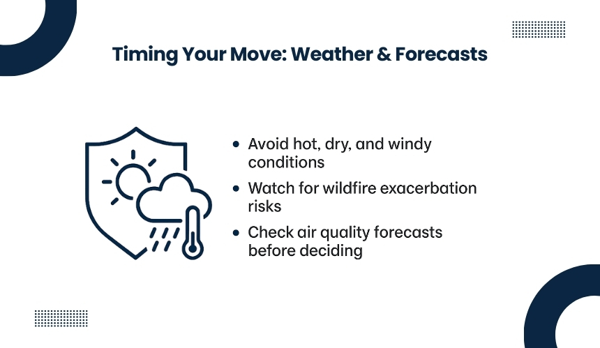 - Temperature and Humidity: Hot, dry weather contributes to wildfire risks, while cooler, moist air can help control fire spread. Look for favorable, calm weather conditions to schedule your move.