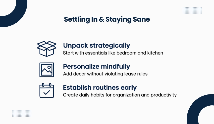 Creating simple routines like unpacking for an hour each evening or organizing one drawer per day makes settling in less overwhelming. Structure keeps progress steady and prevents lingering boxes from piling up.