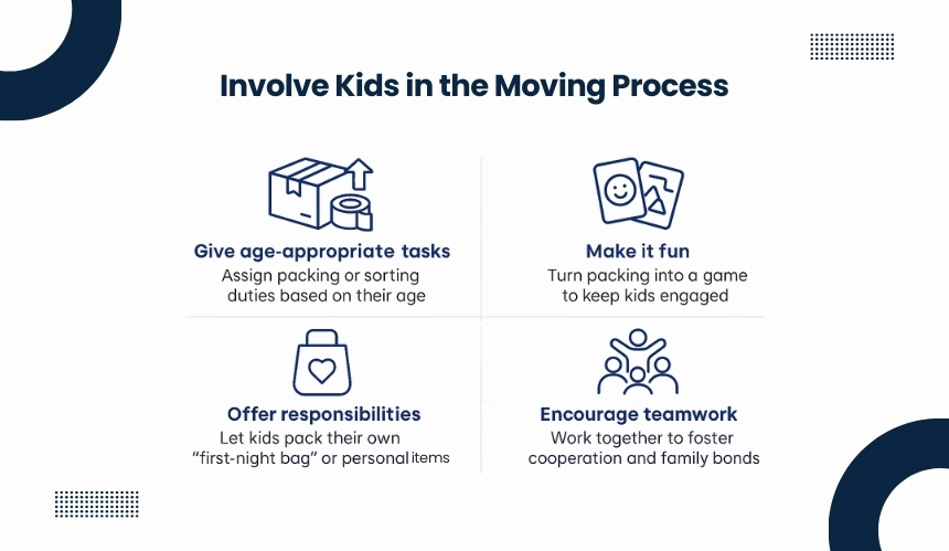 Even simple choices, like deciding what goes into their “first-night bag” or arranging personal items in labeled boxes. Responsibility reassures children that their role matters and that they have some control over the moving process, which lowers anxiety levels.