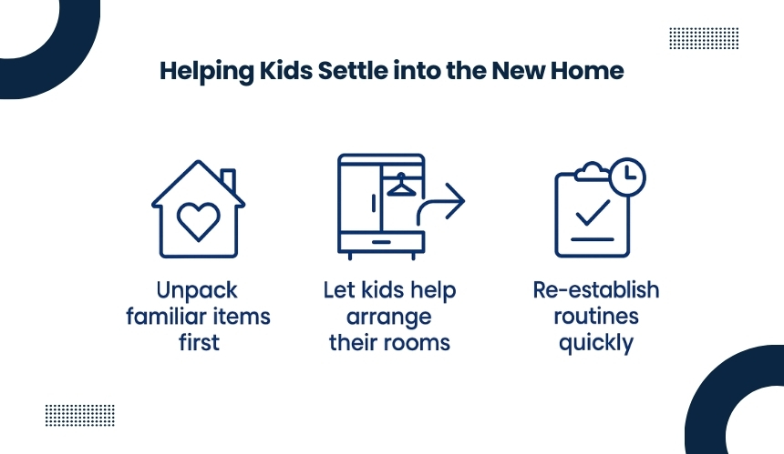 Creating familiarity right away reduces uncertainty. Setting up children’s bedrooms first and unpacking their favorite belongings makes the new space feel personal. Hanging familiar posters, arranging toys, or placing a favorite blanket on the bed provides instant comfort.