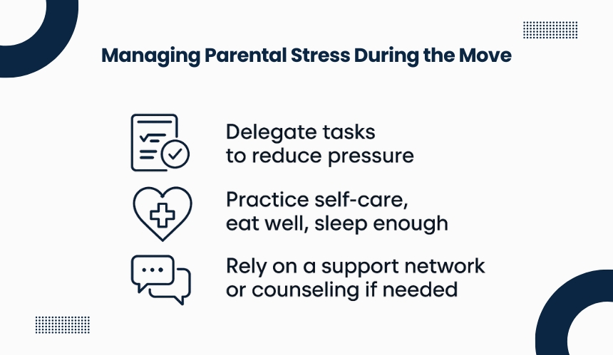 Pets can add to the stress if not planned for. Assigning someone to care for pets on moving day or arranging professional pet transport services allows parents to focus on children while ensuring pets stay safe and calm.