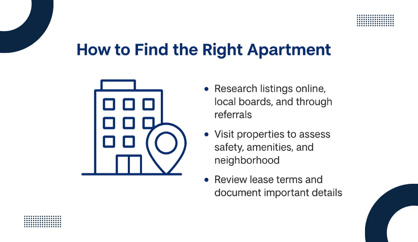 Apartment hunting requires research and patience. Start with online platforms, local bulletin boards, and referrals from friends or colleagues. Schedule visits to compare options in terms of safety, lease flexibility, amenities, and neighborhood quality.
