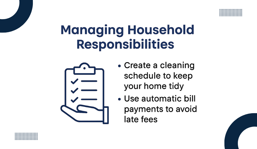 Learning basic cooking, laundry, and maintenance skills saves money and increases self-sufficiency. Tracking these responsibilities with a calendar or app helps maintain balance between work, chores, and personal time.