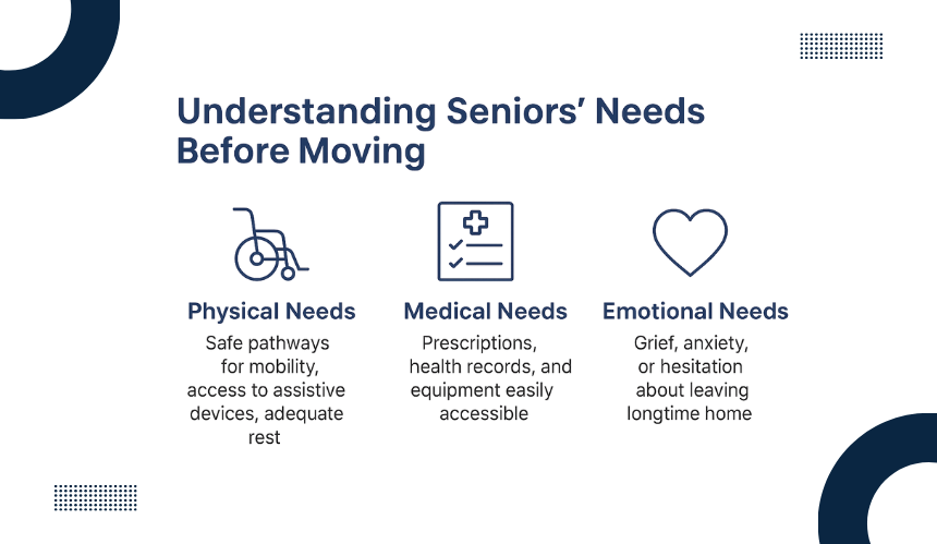 Emotional needs are just as important. Leaving a longtime home can trigger feelings of grief, anxiety, or hesitation. Seniors may experience stress linked to uncertainty, loss of routine, or attachment to familiar surroundings.