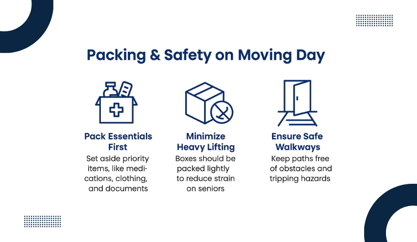 The day of the move can be exhausting for seniors. Keeping safety and comfort as the top priorities helps prevent stress and reduces the risk of accidents.