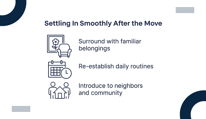 Settling into a new home is an important step in helping seniors feel secure and comfortable after relocation. Surrounding them with familiar belongings such as photographs, favorite furniture, or personal keepsakes makes the environment feel welcoming from the very first day.