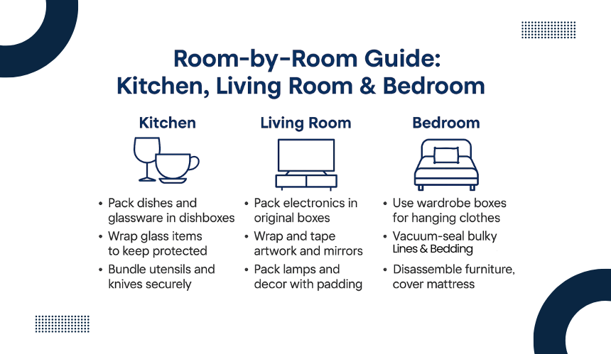 The kitchen requires extra care because it contains delicate items and small appliances. Start by packing non-essential cookware first and leave everyday items for last.