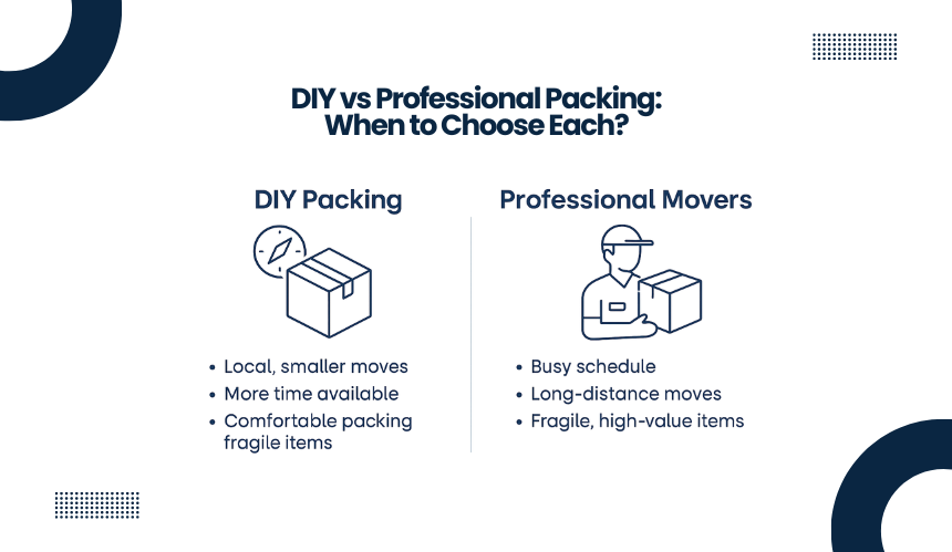 DIY packing works best if you’re moving locally, have fewer belongings, and can dedicate enough time to the process. It’s ideal when you’re comfortable sourcing packing materials and confident in packing fragile items correctly. Choosing this option gives you complete control, but it also demands effort, attention to detail, and a solid plan to avoid damage or delays.
