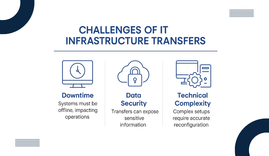 Transferring IT infrastructure comes with several distinct challenges that require careful attention. One of the primary concerns is minimizing downtime. IT systems like servers and desktops need to be offline during a move, which can disrupt business operations.