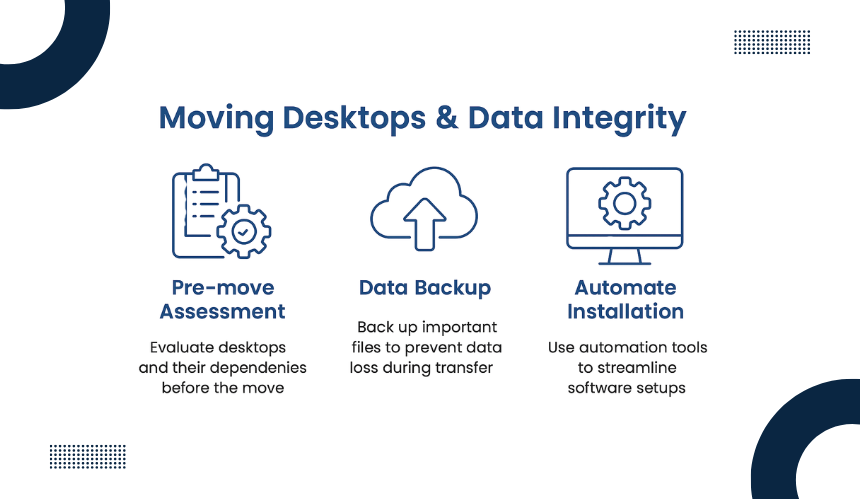 When moving desktops, the goal is to ensure that data remains secure and downtime is minimized. The following best practices can help streamline the process, ensuring that systems are up and running with minimal disruption.