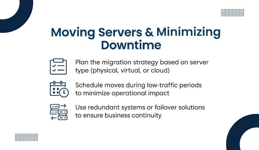 Downtime is inevitable during server migrations, but minimizing it is crucial. Consider using redundant systems or failover solutions to maintain business operations while the primary servers are being moved. This ensures continuity and prevents potential loss of data or service interruptions.