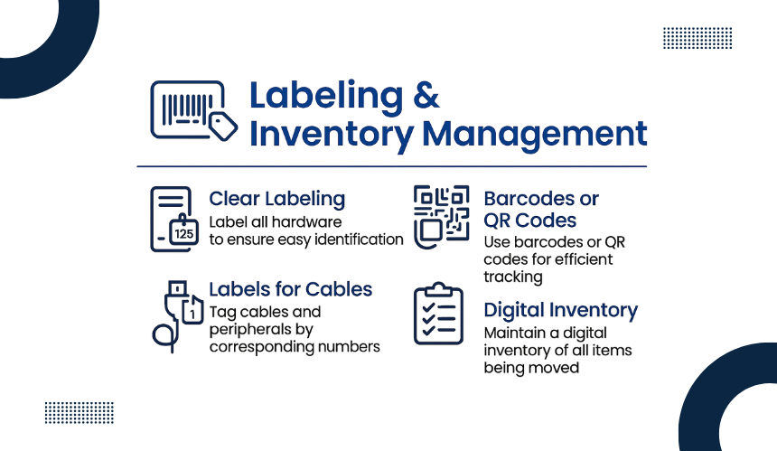 Every piece of hardware, from desktops to servers, should be clearly labeled before the move. Labels should include asset identification numbers, equipment type, and other relevant details to ensure easy identification during reinstallation. This also helps in managing inventory and tracking items throughout the transfer.
