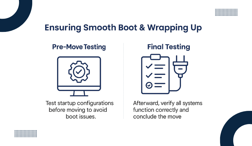 After the initial boot, conduct thorough post-move testing to verify that all systems are functioning as expected. This includes checking applications, services, and hardware functionality to ensure there are no startup failures or misconfigurations.