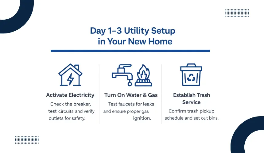 Once you arrive at your new home, the first few days should focus on activating and verifying the core utilities that support safety, comfort, and basic functionality.