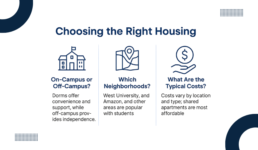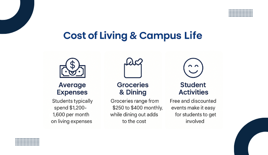 Off-campus rent is the largest expense, while utilities and internet usually add another $100–$200 monthly. Sharing housing with roommates is the most common way students lower their overall costs.