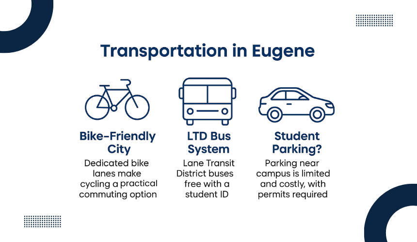 Many students also rely on the Lane Transit District (LTD) bus system, which is free with a University of Oregon student ID. This makes it easy to travel between campus, shopping areas, and student neighborhoods without a car.
